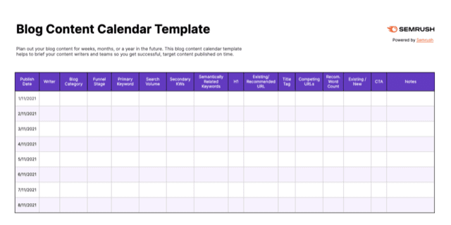 Microsoft Excel or Google Sheets are great tools to start planning a data-driven content marketing calendar. All you have to do is start a new document and figure out what important information you want to keep track of in each column. There are a lot of templates online for different media types that you can copy and paste into your calendar document. For example, Microsoft has a social media content calendar template that makes it easy to start immediately planning things like post captions, hashtags, pictures, dates to post, and more.