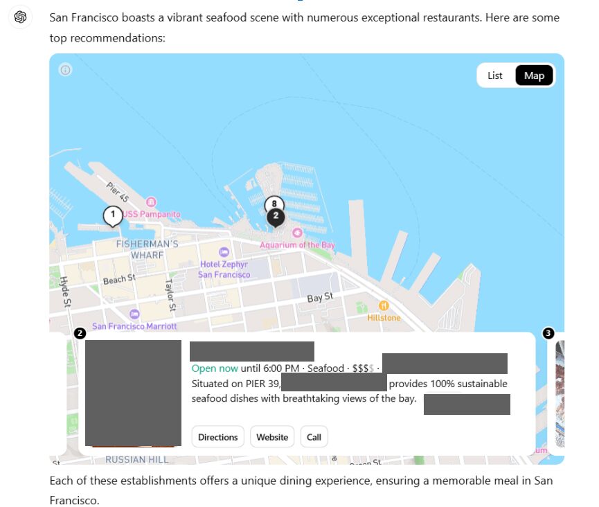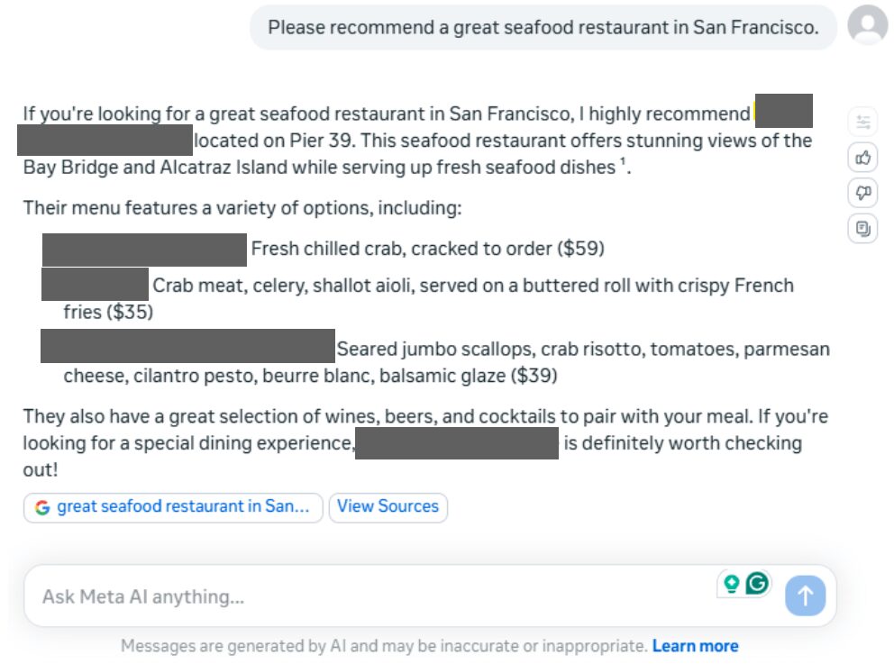 One of our clients is a seafood restaurant on Pier 39 in San Francisco. After a digital marketing campaign with us, the restaurant consistently appears among the top recommendations for seafood restaurants city-wide on platforms like ChatGPT and Meta AI.