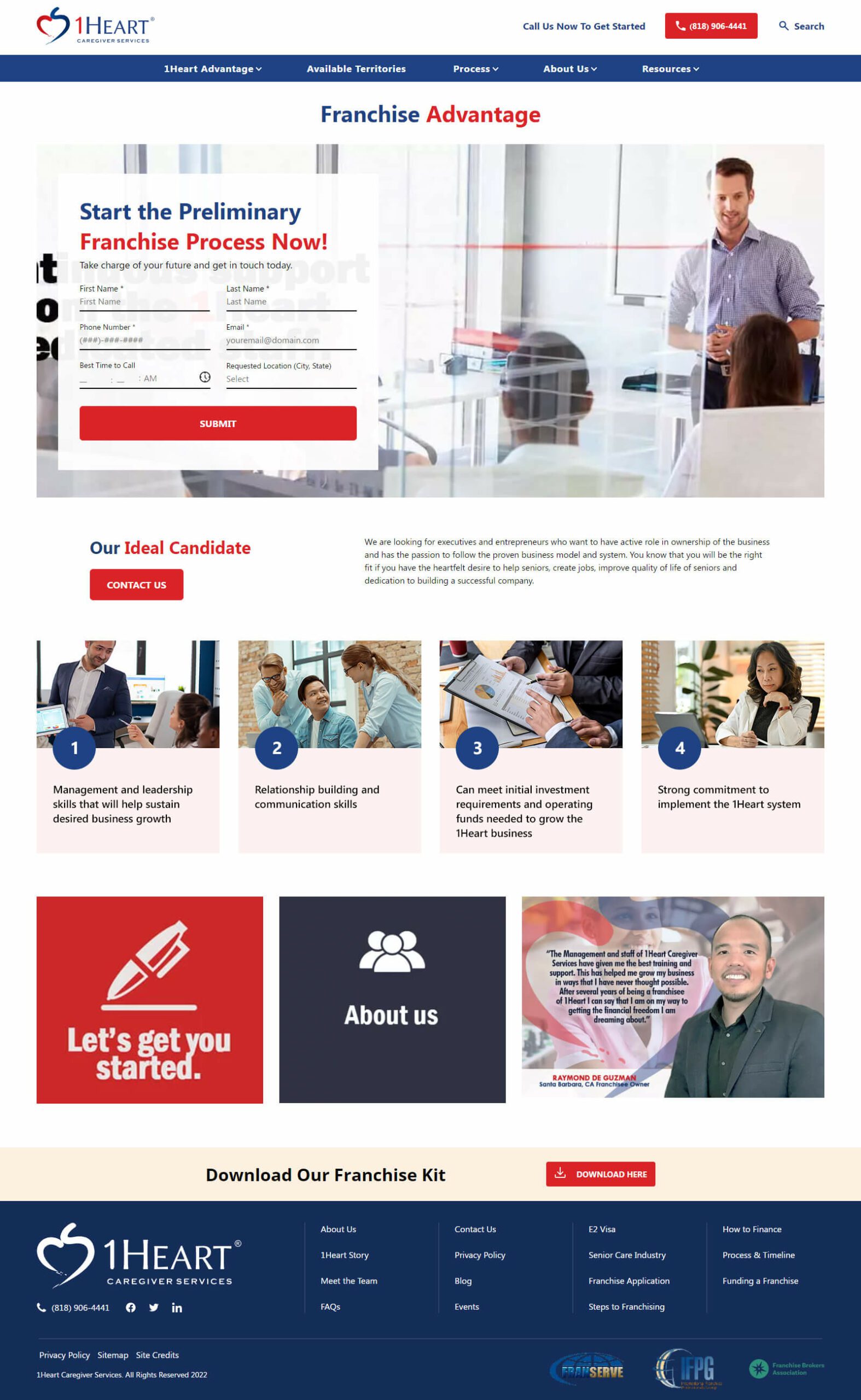 Our design team created navigational and functional sitemaps for the new website. After receiving client approval, mockup pages were created for the home page, category pages, and static pages. Our development and quality assurance team ensured that every page on 1heartfranchise.com was equipped with matching colors, spacing, font, and were correctly styled and arranged. Our copy team created and implemented content for all the website’s pages.