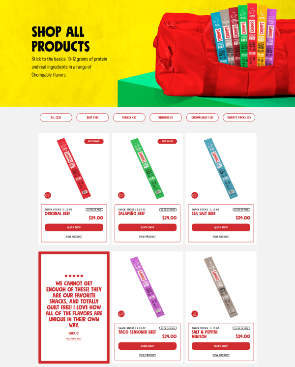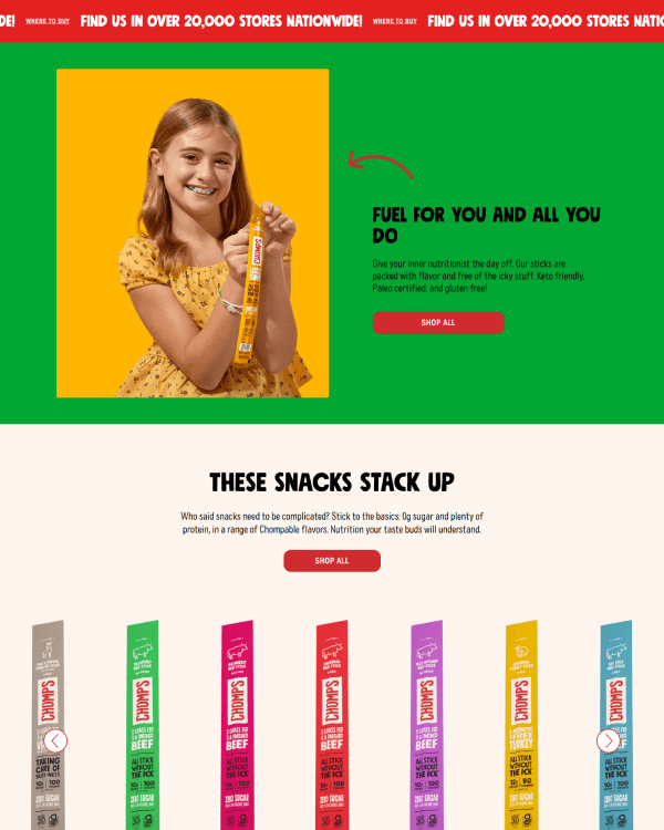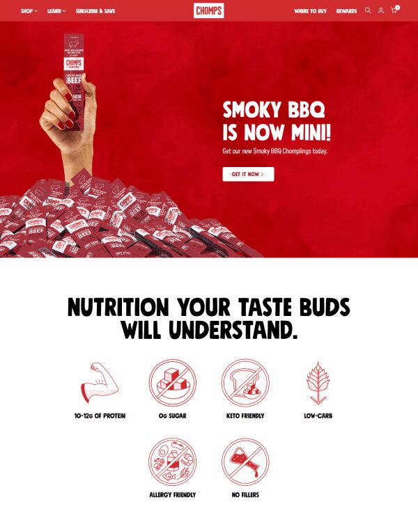 Chomps, a health-focused snack brand offering paleo- and keto-friendly products, has rapidly grown in popularity. Primarily sold in major retailers such as Trader Joe’s, Whole Foods, and WalMart, the brand sought to further expand its reach. They needed a website that could evolve with their growth and meet the demands of their growing customer base. We worked with the client to enhance their website by implementing key development fixes and improvements including optimizing site speed, improving mobile functionality, and refining the wholesale platform.