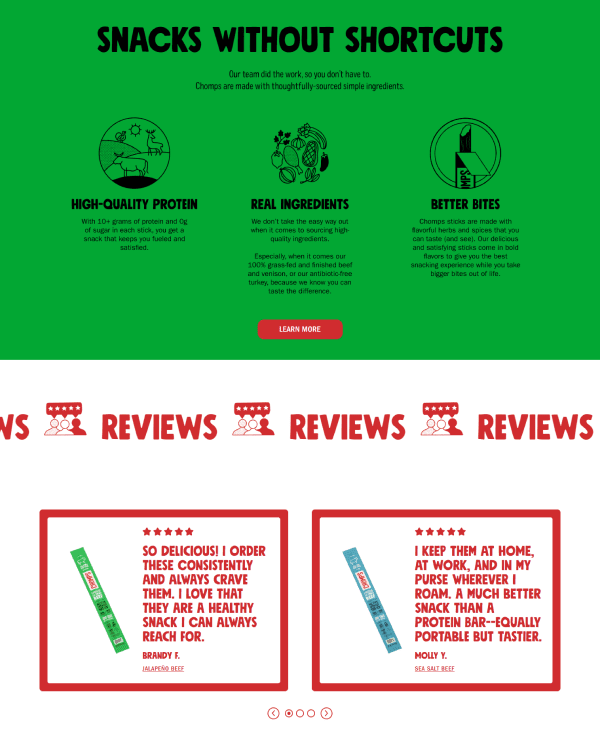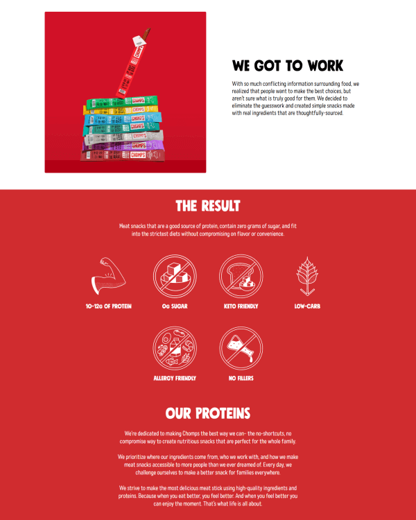 We revamped the About Us page by swapping out outdated images and optimizing the content to align with Chomps’ brand voice. We also simplified the website’s navigation so customers can find and purchase products more easily. Furthermore, we made it simpler for customers to sign up for and manage their subscriptions, and made the “Build Your Own” product feature accessible.
