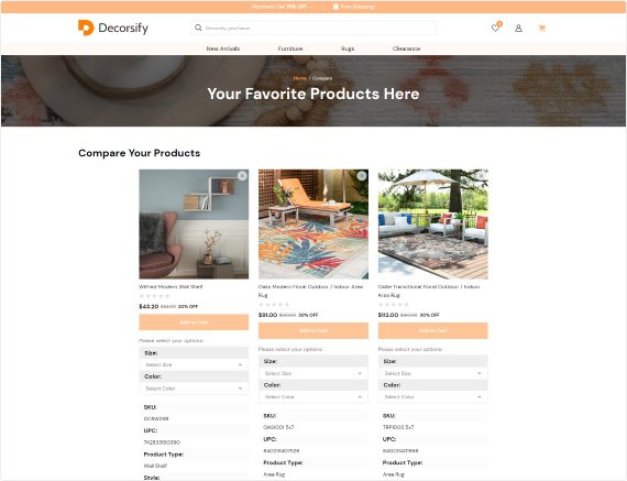 Visitors can now make purchases easily, thanks to the custom comparison page. The custom comparison page app allows customers to compare multiple products simultaneously using custom fields. Users are able to comfortably read and compare product information that they need.