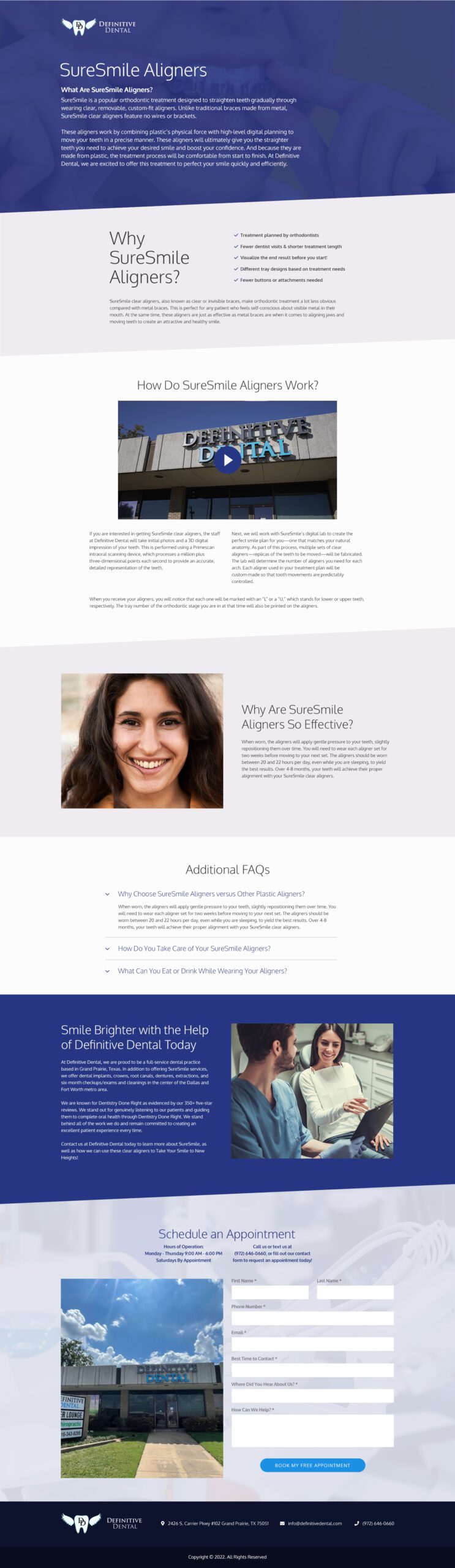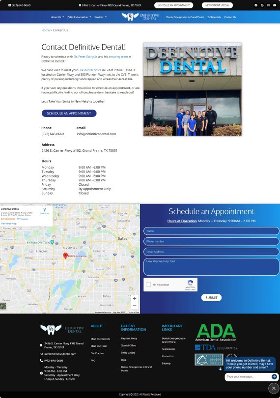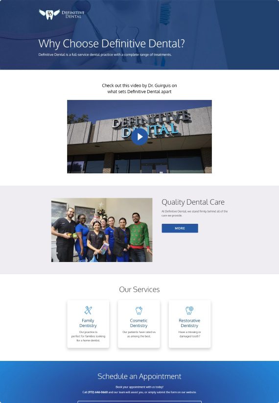 Our team made improvements to definitivedental.com. We added a custom and user-friendly Appointment form that allows patients to schedule their next visit, join the dental office’s mailing list, and request additional information all within a few minutes. Updates were made to improve mobile view and responsiveness. The homepage was amended to showcase the state of the art office and the specialty services offered. We developed and implemented a custom blog post template on the website and updated their video and FAQ schema.