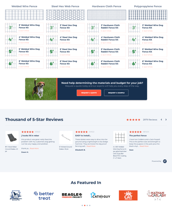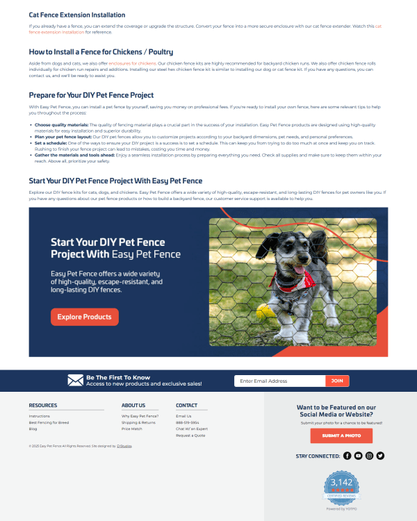 Easy Pet Fence’s new BigCommerce website features a curated influencer content feed and improved navigation with a dynamically generated mega menu. Accordion-style FAQs and personalized recommendations were added to product pages for clarity and content depth. Content was optimized for SEO, with streamlined product titles and categorized reviews. To boost engagement, we incorporated a curated social feed and YouTube tutorials within a stylish popup interface. The website also includes a customized Request A Quote form and enhanced ADA compliance features.
