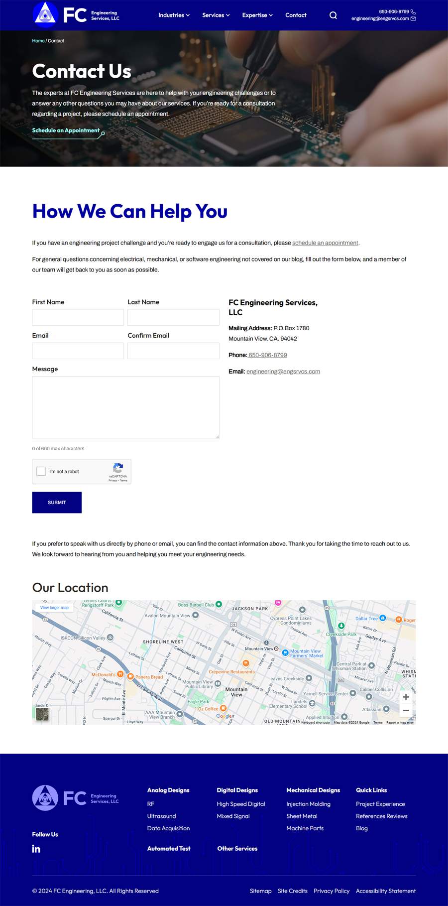 FC Engineering Services offers expertise in analog circuit design, software development, high-speed design, and mechanical systems across industries like defense, telecommunications, medical devices, and automated systems. However, their outdated website and lack of SEO optimization hindered their ability to attract new clients in a digital-first market.