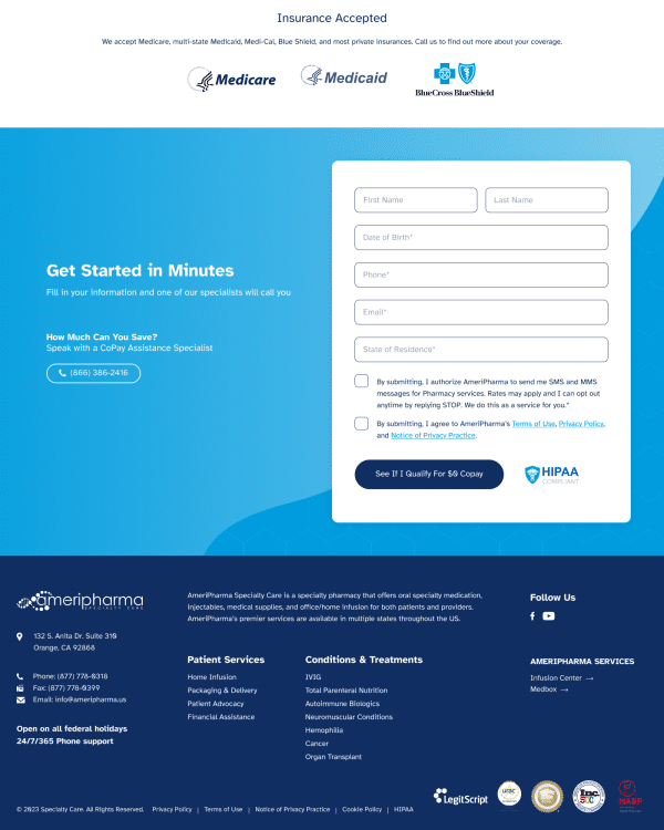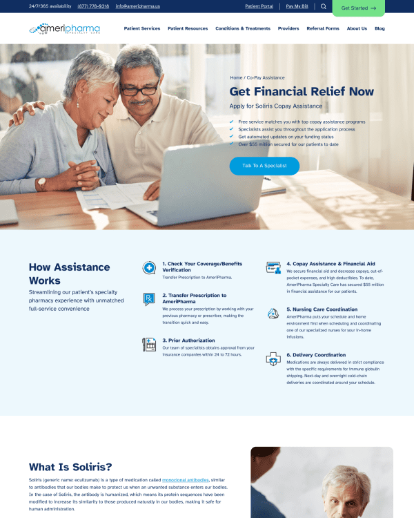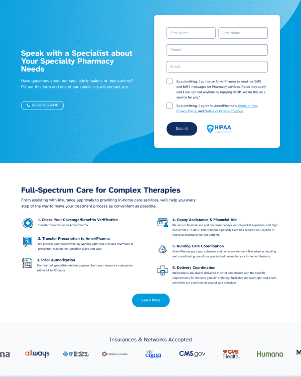 We redesigned AmeriPharma’s website to prioritize user experience, mobile optimization, and trust-building. Key features, such as simplified prescription refill forms, intuitive provider portals, and custom communication forms, enhanced usability. Pages for IVIG therapy, TPN, and oncology treatments were added alongside GDPR-compliant cookie consent integration. SEO efforts increased visibility with optimized content, targeted keywords, and revamped blog articles, boosting rankings for specialty medications. On-page SEO improvements, such as image compression and browser caching, enhanced loading speed, while conversion tracking provided actionable insights to continuously optimize performance.