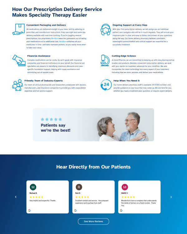 AmeriPharma’s old website didn’t reflect the high level of care they provide. It was underdeveloped for their target audiences (i.e., patients, healthcare providers, and caregivers) and lacked mobile optimization. Content (particularly for key services such as IVIG therapy, TPN (Total Parenteral Nutrition), and oncology medications) was not tailored to target critical keywords, hindering the website’s ability to rank effectively on search engines.