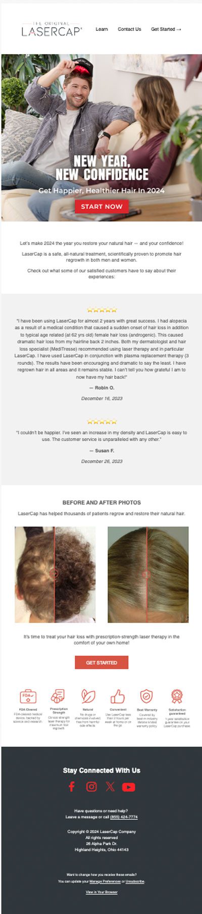 To convert website visitors into subscribers, we created a visually appealing pop-up that appears when a new user lands on the website. The messaging is specifically tailored to LaserCap’s audience to drive conversion.
