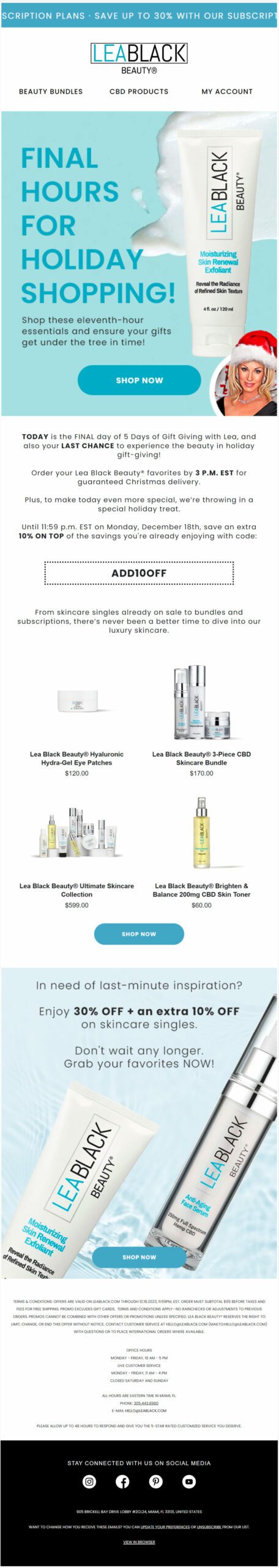 The client saw impressive results with their first Black Friday Cyber Monday (BFCM) marketing campaigns with us. Lea Black Beauty saw excellent open, click, and placed order rates for its email campaigns. One of our BFCM email campaigns netted a 61% open rate, surpassing the industry average (21%). Another specialty BFCM email campaign netted a 64% open rate, and a 3.4% click rate—both exceeding the industry standards. Another BFCM email campaign had an open rate of 66.8%.