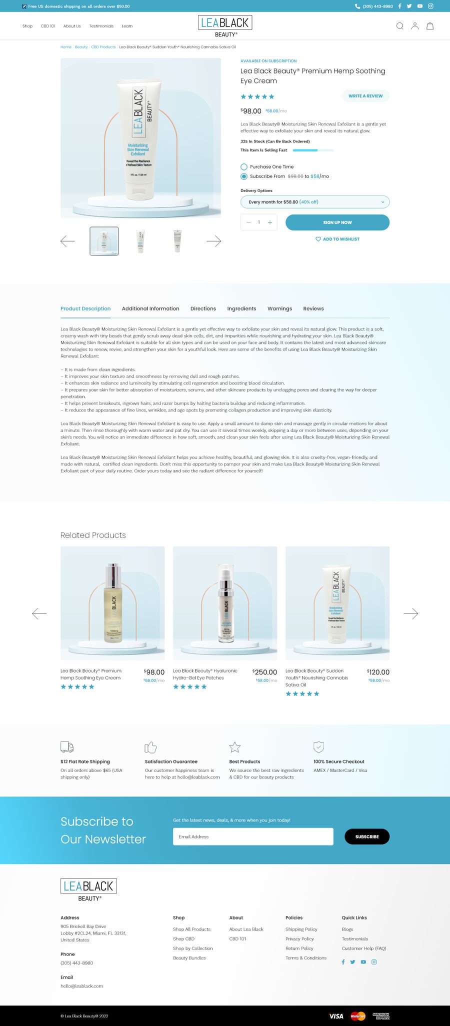 For more than 20 years, TV personality Lea Black has been developing and selling Lea Black Beauty products, some of which are made with ethically sourced Cannabidiol (CBD). The brand sells products such as eye cream, face wash and masks, oils, exfoliants, sunscreen, lip balms, and lotions, among other things. The client had a slow WordPress website and needed a modern website. They contacted us, a Shopify Plus partner, to build a new website and migrate their existing WordPress website over. They also engaged us for their digital marketing needs.