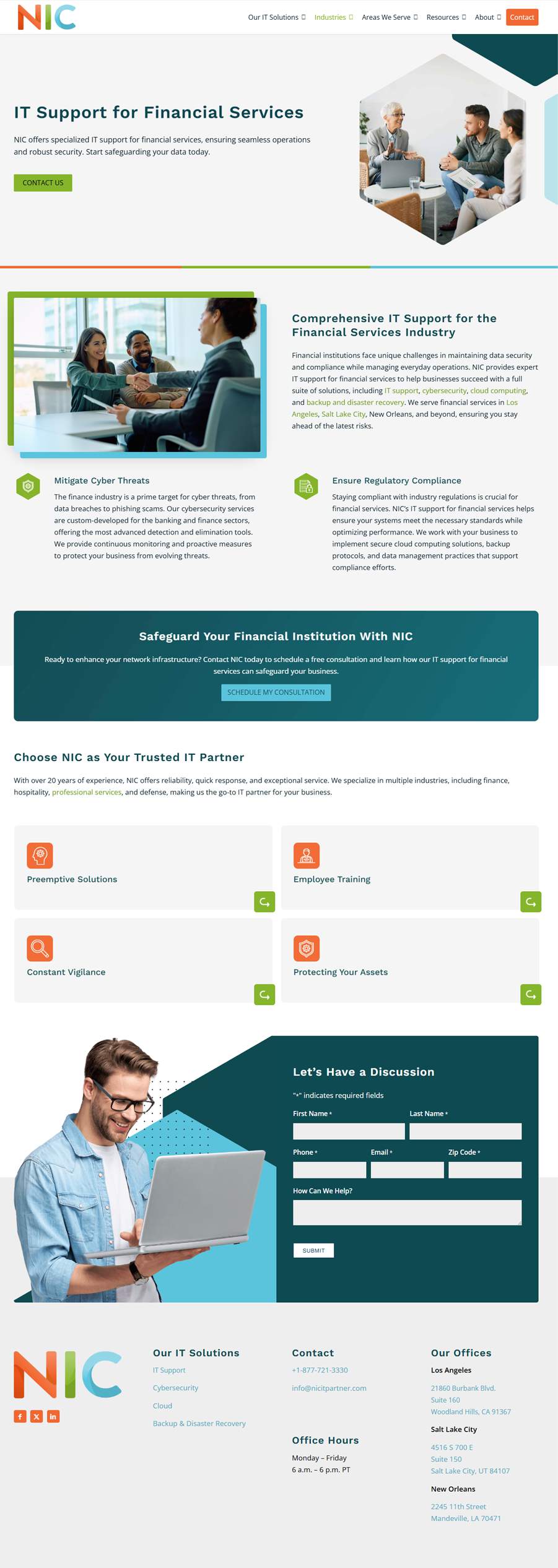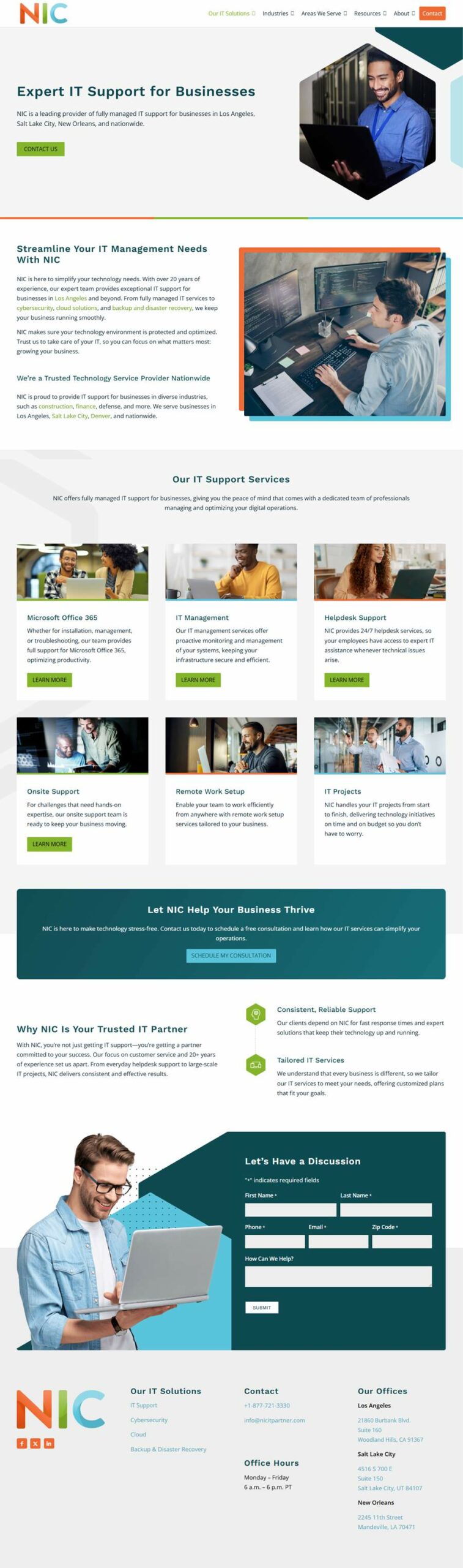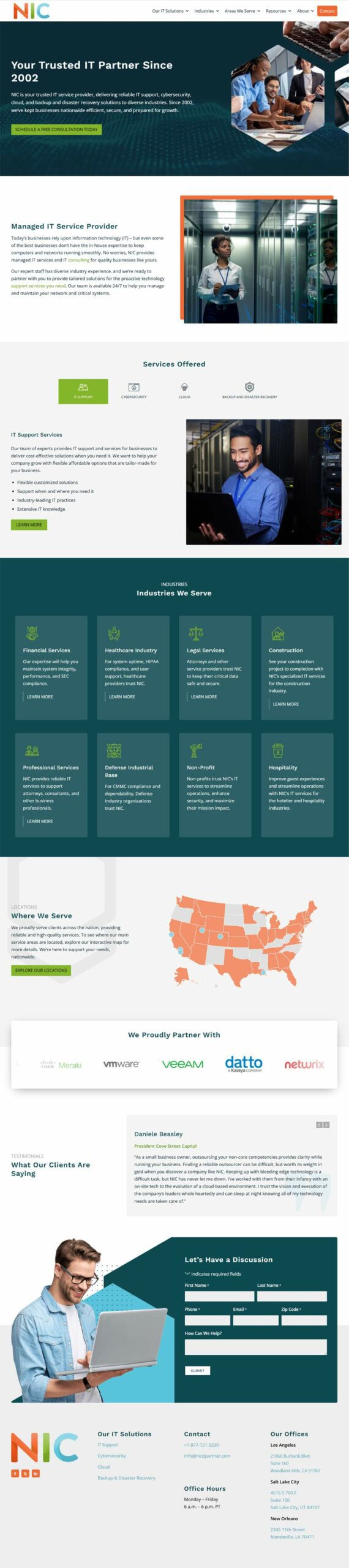 Each of NIC IT Partner’s core services, including IT support, cloud services, cybersecurity, and disaster recovery, was given dedicated landing pages with detailed information about offerings and solutions. Clear call-to-action (CTA) buttons, such as “Schedule a Free Consultation” and “Learn More” were strategically placed to encourage visitors to reach out for services. A contact form was also simplified to improve conversion rates.