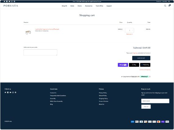 The previous site’s HTML sitemap was missing. When customers added product to their shopping carts, no notification or message was shown stating that the product was added. Our team added a pop-up notification message to show that a product was added to a shopping cart, as well as other CTAs. The new cart page also has the Continue Shopping CTA located at the top.