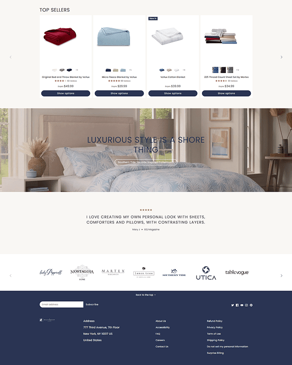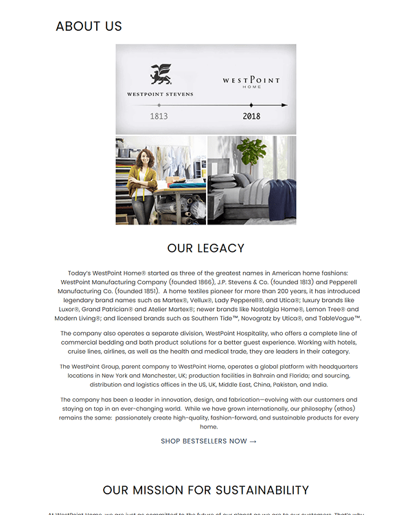WestPoint Home, a parent company with multiple subsidiaries, sought to present its brands using a streamlined, user-friendly website while preserving each brand’s identity. Using the Shopify Plus Elegant Theme, we built the website using their provided designs. To enhance brand awareness, increase traffic, and drive sales, we implemented search engine optimization (SEO), pay per click (PPC), and email marketing strategies.