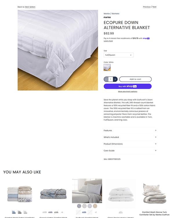 We optimized the website’s structure, content, and product listings, with a key focus on revamping copy to be more engaging, informative, and search-engine friendly. We redesigned the blog layout with mobile optimization in mind and SEO-driven content to boost visibility. Featured products such as Vellux’s blanket range and Gryphon Home’s luxury Supima cotton bedding were highlighted as well.